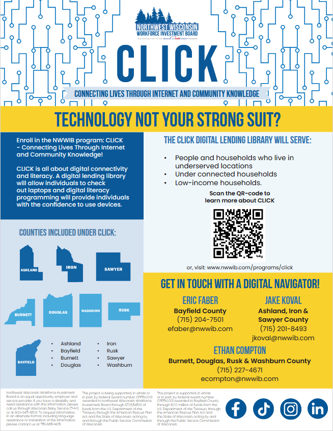 Check out Northwest Wisconsin Workforce Investment Board’s CLICK program (Connecting Lives through Internet & Community Knowledge). The new Digital Navigator, Jake Koval, will be at the library on Mondays the month of January from 10am-2pm. Stop by with your phone, tablet, and laptop questions. He’s here to help you. Also, through the CLICK & Learn program, there are laptop computers available for checkout. It’s just like checking out a book. Long-term loans are available for those who may need a laptop for classwork.